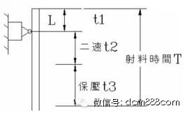 首先看打料时间:它是指打料开始到打料结束的时间,打料时间它包括着一速打料时间(T1)二速打料时间(T2)和保压时间(T3)。