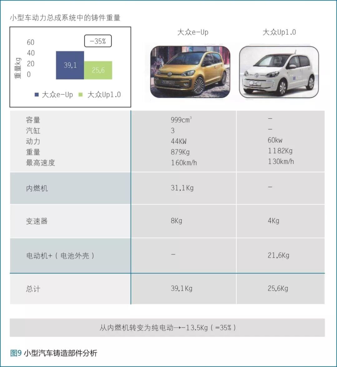 图9中的比较情况表明,通过电动化,铸件重量预计减少约35%。不同驱动方式下,铸件重量的直接比较显示,经典内燃机到紧凑型轿车全混合动力的改变,使得铸件重量增加了约27%。