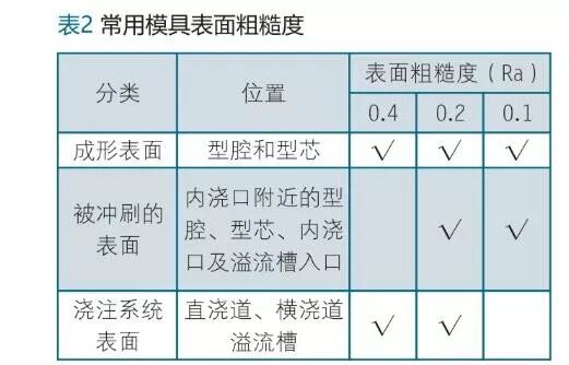 portant; overflow-wrap: break-word !important;"> 模具表面应该具有合理的粗糙度。粗糙度过大对模具损害较大,但不是粗糙度越小越好,要避免模具表面过度抛光。可以对模具表面进行喷砂、氧化处理和用细砂纸打磨等方法处理,这样利于脱模剂分布均匀,也可以防止镜面表面造成的压铸合金与模具表面产生粘结,使模具表面产生针孔。推荐模具表面粗糙度如表2所示。