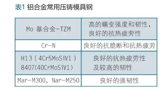 portant; overflow-wrap: break-word !important;"> 对于铝合金压铸的模具钢材应具备:1)优良的高温强度和韧性;2)优良的高温耐磨性和抗热疲劳性;3)良好的热处理性和切削加工性。如表1所示 ,常 用 的 模 具 钢 有 国 产 的4Cr5Mo Si V 钢、瑞典一胜百的 8407、日本的SKD61、美国的 H13 等。模具厂家应根据实际生产需求,选用适当的模具材料。