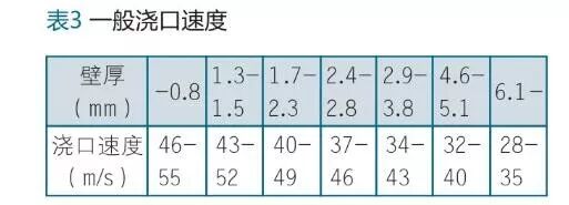 portant; overflow-wrap: break-word !important;"> 充填速度对粘铝的影响也是非常直观的。充填速度过快,会带来一系列问题,对模具有很大的损伤。当充填速度过快,会使金属液呈颗粒状或雾状进入型腔,对模具型腔有很剧烈的冲刷作用,或者直接破坏脱模剂表层,粘附在型腔壁上,产生粘铝缺陷。所以,验证充填速度的合理性,对粘铝缺陷有极大的帮助。推荐的浇口速度如表3。